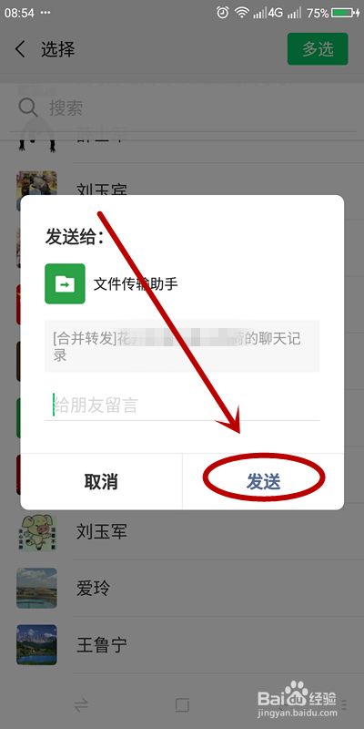 选择“文件传输助手”单击后,在“发送给”对话框,单击“发送”,聊天记实就被处处到电脑上