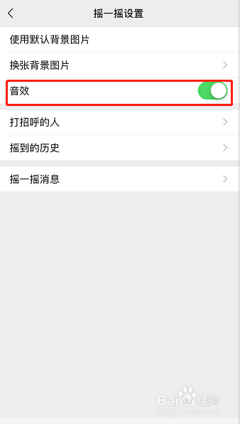 然后在摇一摇设置本家儿页下找到【音效】一栏,如图所示,滑动此栏右侧的滑块封闭音效!