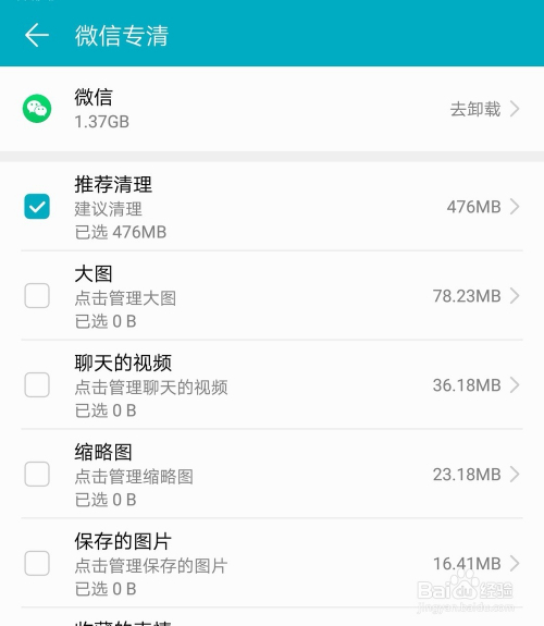进入优化微信占用空间后,不克不及盲目标点击清理。