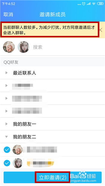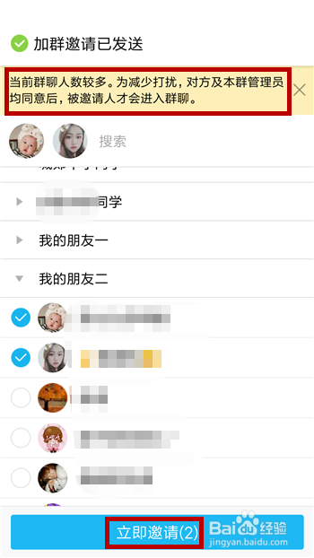 选择老友后点击【当即邀请】,这时辰上方提醒我们对方赞成后可进群。