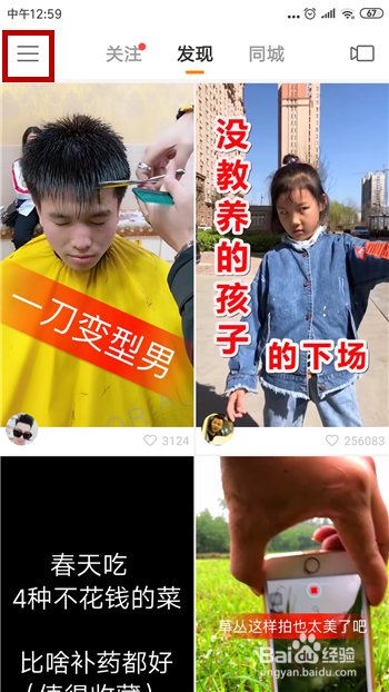 打开手机上的快手,然后在首页点击左上角的【三】。