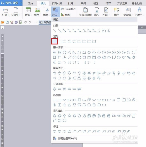 第二步:在菜单栏“插入--外形”中选择矩形,在文档中画出一个矩形。