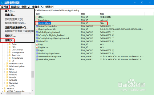 点击窗口左上角的【文件】,鄙人拉菜单中点击【退出】,退出注册表编纂器。