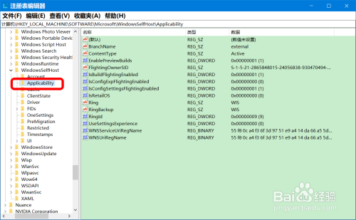 复制:\HKEY_LOCAL_MACHINE\SOFTWARE\Microsoft\WindowsSelfHost\Applicability 注册表路径到地址栏中;