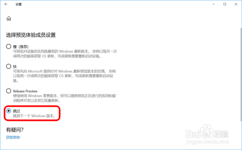 在打开的 选择预览体验当作员设置 窗口,我们点击:跳过- 跳到下一Windows版本,且逗留在这个窗口不动。