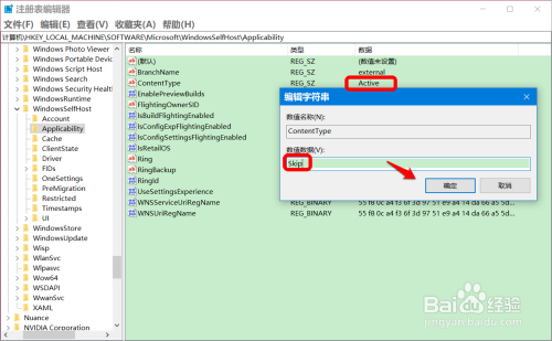 在 Applicability 对应右侧窗口中找到并左键双击:ContentType,将其数值数据从【Active】更改为【Skip】,再点击确定;