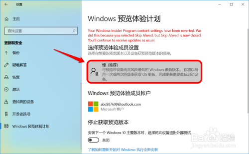 在Windows 预览体验打算窗口中,我们点击:选择预览体验当作员设置 下的【慢】;