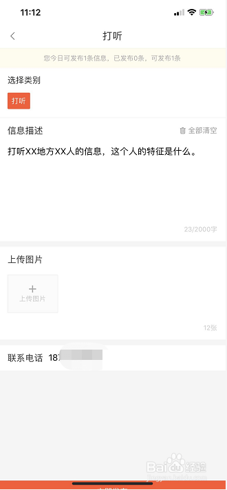 这里以发布探问信息举例,输入你要探问的人或者事,第一句话会主动当作为题目。输入你要探问的人和事的具体特征信息,有照片上传相看护片,以便利探问。最后再留下你的联系体例。