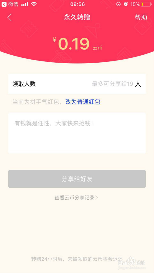 在底部弹出的选项中选择永远转赠,在永远转赠界面设置领取人数点击分享给老友。在该云币有用期小于1天,若是发生退还会导致退还云币过时窗口,点击 继续分享。