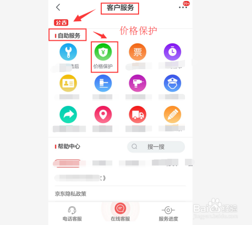 在客户办事中的自立办事中找到价钱庇护,点击进入价钱庇护页面。