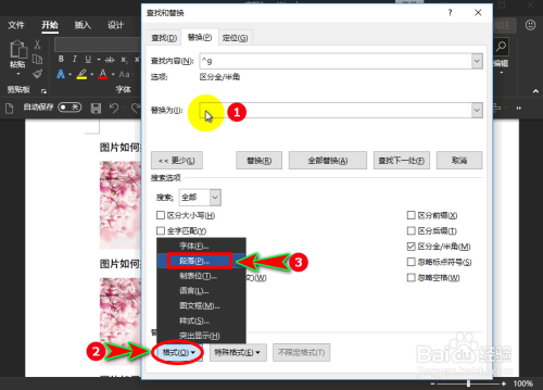 点击扩展项中的“特别格局”选项,在其扩展项中我们点击“图形”项,这时“查找内容”处就输入了图片的代码^g。如图所示: