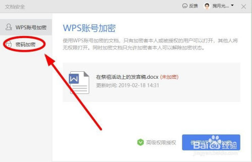 在“文档平安”对话框,我们可以利用“WPS账号加密”也可以利用“密码加密”。我没有WPS账号,选择“密码加密”单击