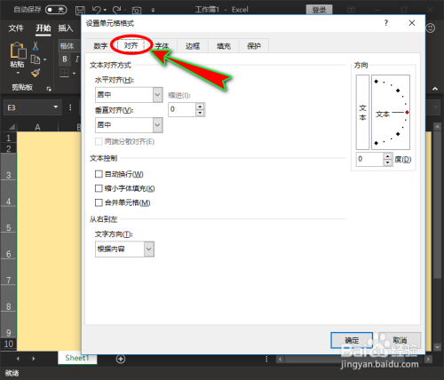 在“设置单位格格局”对话窗中,我们点击“对齐”子项,并进入其界面中。如图所示: