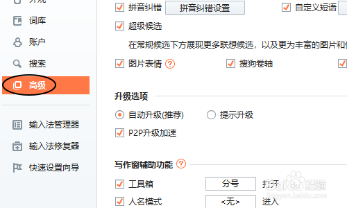 若是今后我们也不想让输入法记住我们的输入习惯,那么依旧在以上的对话框,点击左侧的“高级”而且将“智能输入”下方的所有选项全数打消勾选即可;