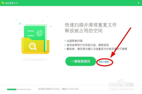 在弹出的“查找反复文件”对话框,可以“一键智能查找”也可以“自界说”查找。这里我们单击利用“自界说查找”