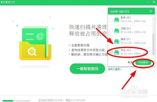 我们此刻在电脑“G”盘内查找反复文件,选择操作规模后,单击“起头查找”