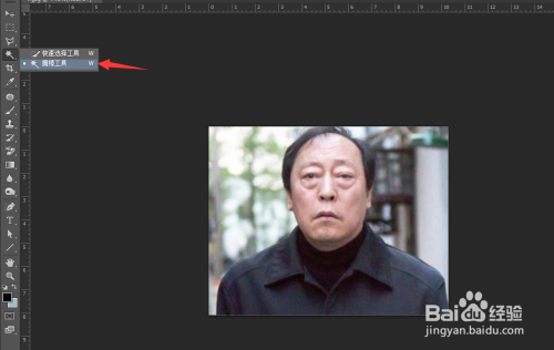 接着我们首先,打开我们的素材,将苏大强的图片拖到PS操作区域中,然后利用魔棒东西,如下图所示。