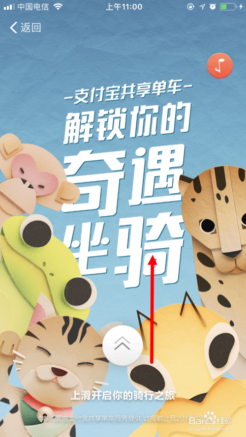 然后就会进入 支付宝共享单车 解锁你的奇遇坐骑 的页面,用手指标的目的上滑动。