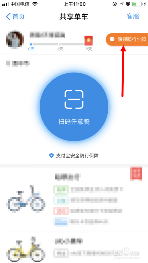进入 共享单车 的页面后,点击 解锁骑行坐骑 。