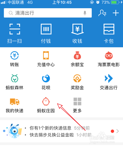 首先,我们打开支付宝首页,然后点击页面如图所示的蚂蚁庄园进口打开蚂蚁庄园
