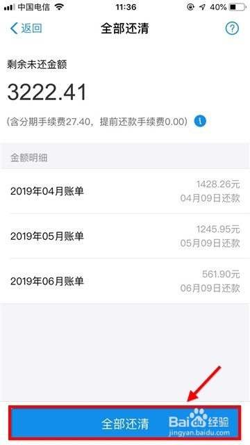 进入问题后,再次点击蓝色的“花呗提前结清”链接,跳转到结清界面。