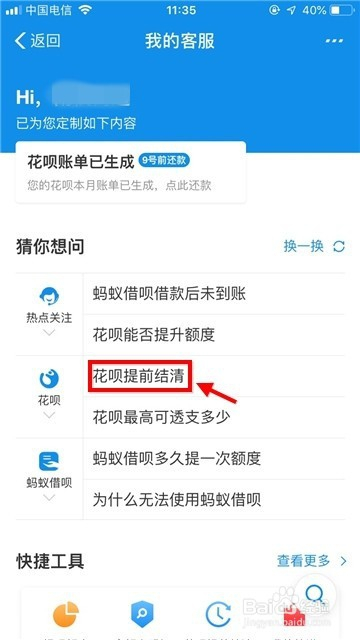 此处会枚举一些热点问题,在花呗那栏找到“花呗提前结清”点击该问题进入。
