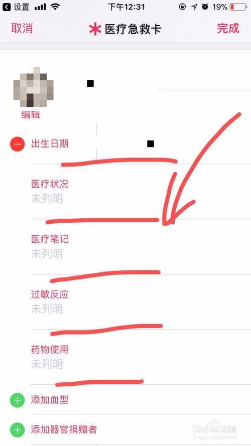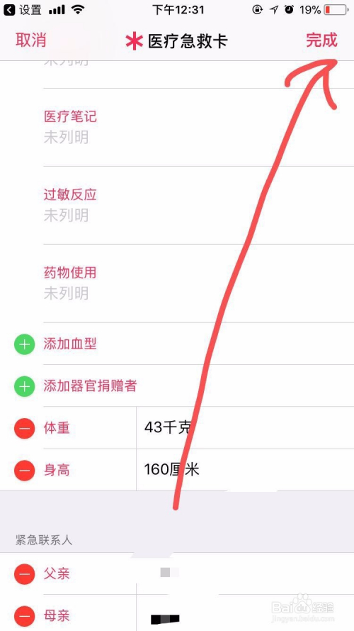 主动呼叫开启之后点击下面的在“健康”中设置告急联络人,界面会主动跳转到健康医疗急救卡;