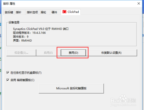在鼠标属性界面,选择ClickPad选项卡,可以看到触摸板的具体信息,默认环境下,触摸板功能是启用的。