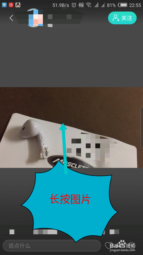 在打开的图片界面,在屏幕上面长按图片。如图所示