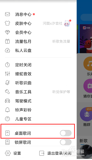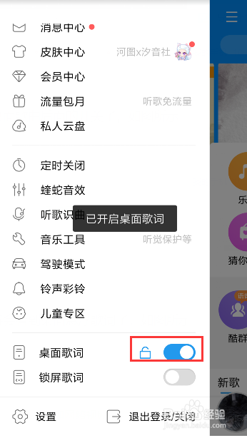 这时,就打开桌面歌曲后面的开关了,如图所示