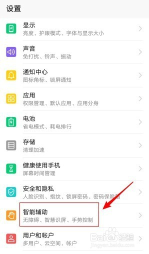 进入设置页面后,标的目的下找到“智能辅助”,并点击进入。