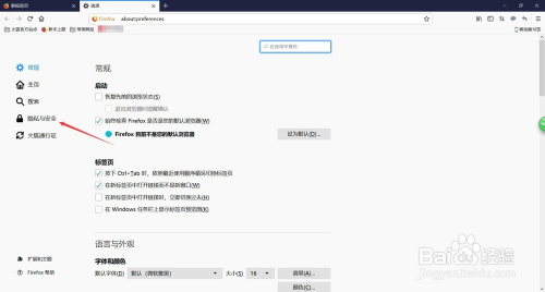 进入选项设置之后,默认的是常规项设置,我们选择左侧菜单的“隐私与平安”,如图所示。
