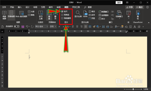 在“视图”菜单下找到“显示”选项组,然后在该选项组里找到并开启“标尺”功能。