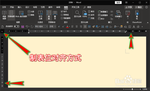 开启“标尺”功能后,在文档页面的左侧和上方标会显示出标尺,在左上角就会有一个制表位的对齐体例按钮。