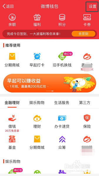 然后在微博钱包本家儿页下的右上角,找到【设置】选项,如图所示,点击该设置选项!