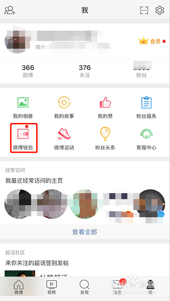 在我的本家儿页下找到【微博钱包】一栏,如图所示,点击进入该栏!