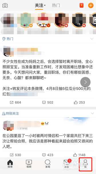 登录本身的微博账号,进入账号首页。找到首页右下角【我】图标,如图所示,点击该图标进入我的本家儿页!