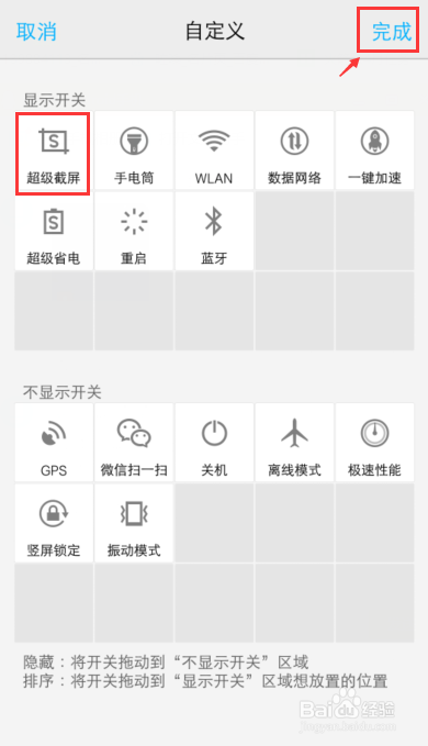 进入自界说页面,移动【超等截屏】到显示开关下方。