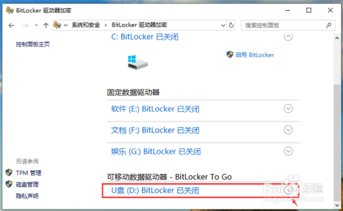 进入BitLocker驱动器加密页面,往下滑动页面,找到U盘,然后点击U盘边上的箭头。