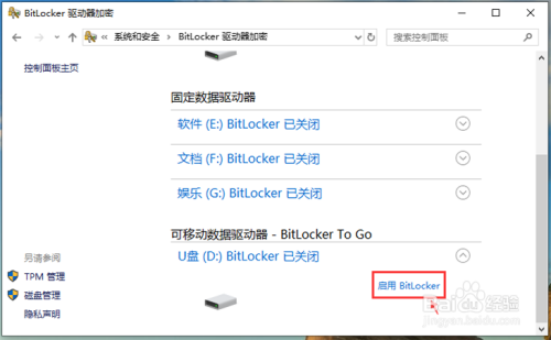 呈现下拉页面,点击【启用BitLocker】。