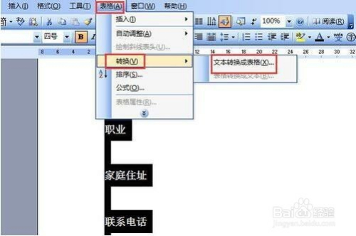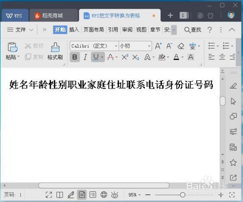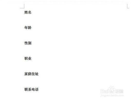 打开要处置的文档。如:姓名春秋性别职业家庭住址联系德律风身份证号码。我们要把它设置当作一张4行4列的表格,要求每一个文字段后面留一个空格。如何处置呢?