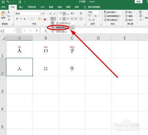 选中A1单位格,找到“拼音指南”后面的小箭头单击