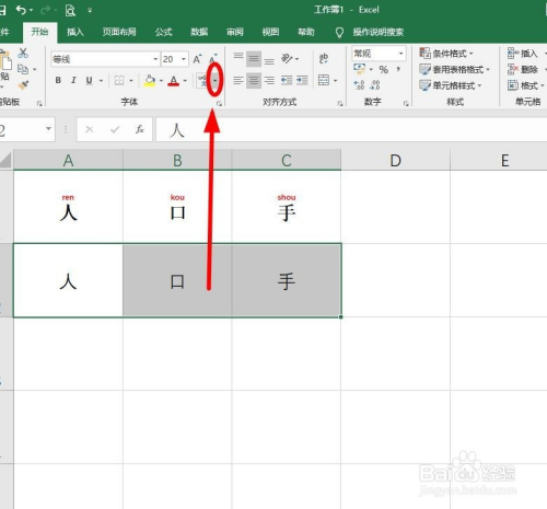 选中A2-C2单位格,找到菜单栏“起头”选项卡下的“拼音指南”单击