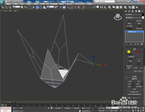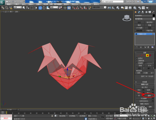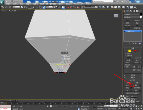 点击右边工作区中的【边】图标,选中图示模子上的边后,点击【挤出】右边的小方框并设置好挤出的各个参数。按图示对挤出的边进行缩放后,继续进行挤出操作。完当作后,将四个点焊接为一点(如图所示);