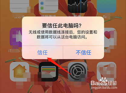 用数据线将iphone和电脑毗连起来,在弹出的对话框中,选择“信赖”;