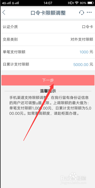 显示当前的支付限额设置环境,好比小编要设置的是口令卡的支付限额,点击该选项。