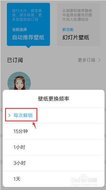 完当作后,返回锁屏画报,往下滑动页面,点击【壁纸改换频率】。