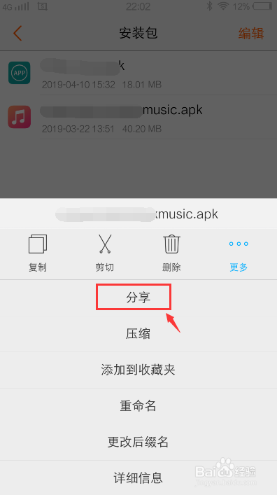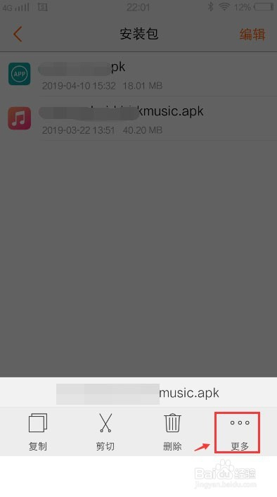 进入安装包页面,选摘要传输发送的应用安装包,好比:music,长按该应用安装包。