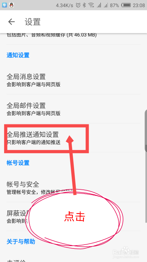 在设置界面,滑动屏幕找到通知设置,点击全局推送通知设置。如图所示