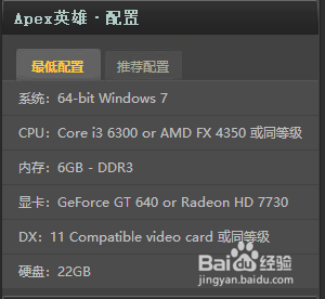 - 1首先我们领会一下apex英雄的最低官方要求设置装备摆设,若是连这个设置装备摆设都达不到的话就不建议用此电脑进行游玩了。